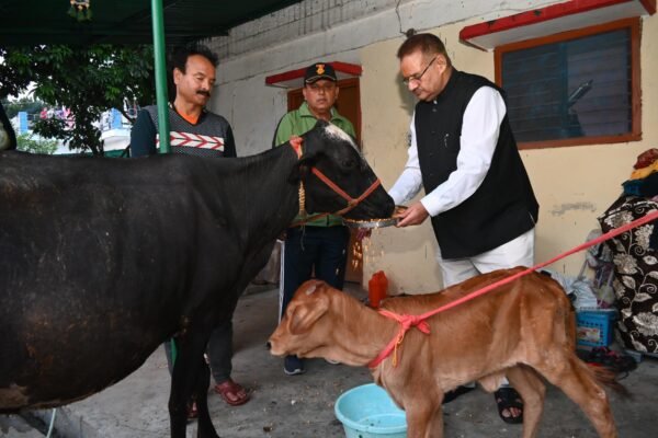 गोवर्धन पूजा के अवसर पर गौमाता को गुड और चना खिलाते कृषि मंत्री गणेश जोशी