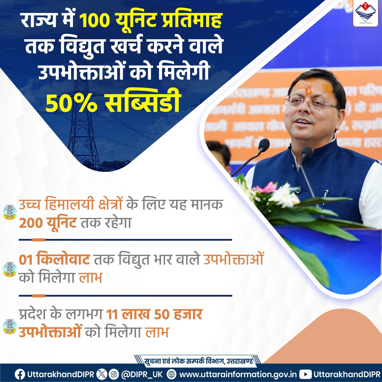 मुख्यमंत्री पुष्कर सिंह धामी द्वारा दिनांक 16 सितम्बर, 2024 को की गयी घोषणा के क्रम में राज्य के घरेलू श्रेणी के विद्युत उपभोक्ताओं को विद्युत टैरिफ में सब्सिडी प्रदान करने के सम्बन्ध में शासनादेश जारी कर दिया गया है।