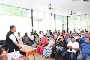 पार्टी कार्यकर्ताओं के साथ हर घर तिरंगा अभियान के अंतर्गत आयोजित होने वाले कार्यक्रमों की तैयारियों के संबंध में बैठक करते कैबिनेट मंत्री गणेश जोशी