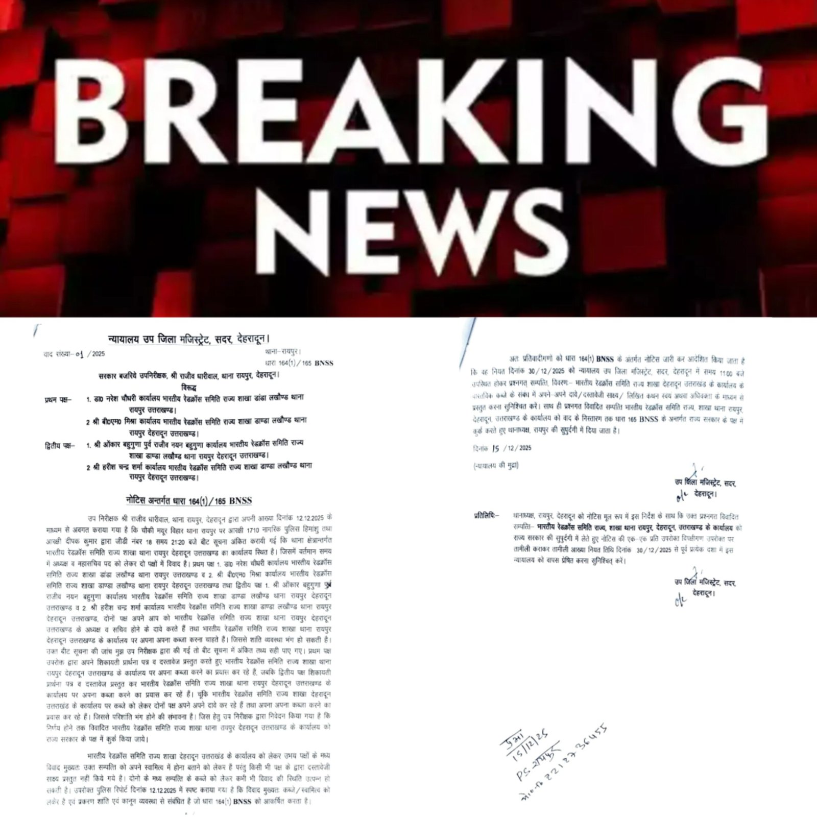 जिला प्रशासन ने परिस्थितियों को दृष्टिगत रखते हुए, धारा 164 (1) बीएनएसएस के अंतर्गत दोनों पक्षों/प्रतिवादीगणों को नोटिस जारी किए गए हैं। प्रतिवादीगणों को निर्देशित किया गया है कि वे 30 दिसम्बर 2025 को प्रातः 11 बजे न्यायालय उप जिला मजिस्ट्रेट, सदर, देहरादून में उपस्थित होकर प्रश्नगत सम्पत्ति/भारतीय रेडक्रॉस समिति, राज्य शाखा, देहरादून (डाण्डा लखौण्ड) के कार्यालय के वास्तविक कब्जे के संबंध में अपने-अपने दावे, दस्तावेजी साक्ष्य एवं लिखित कथन स्वयं अथवा अधिवक्ता के माध्यम से प्रस्तुत करने के निर्देश दिए है। वाद के निस्तारण तक विवादित कार्यालय को धारा 165 बीएनएसएस के अंतर्गत राज्य सरकार के पक्ष में कुर्क किया जाता है तथा इसकी सुपुर्दगी थानाध्यक्ष, रायपुर को दी जाती है।