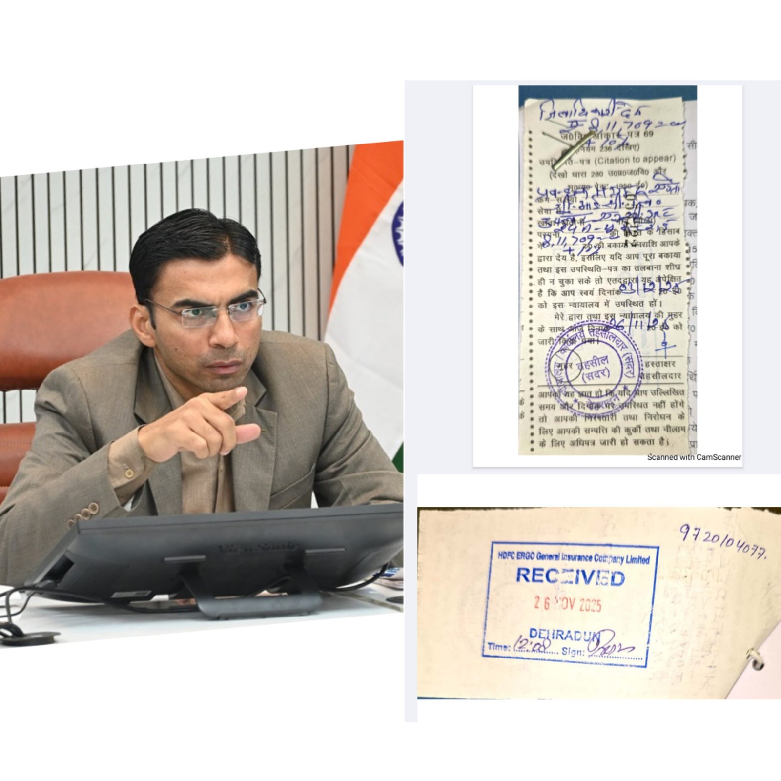 जिलाधिकारी ने मु० 8,11,709/- (रू० आठ लाख ग्यारह हजार सात सौ नौ मात्र) की वसूली एचडीएफसी अरगो जीआईसी लि०, 3 फ्लोर, एनसीआर डेवलपर्स, 24ए, न्यू कैन्टोनमेंट रोड, विजय कॉलोनी, शक्ति कॉलोनी, देहरादून के नाम आरसी काटते हुए भू-राजस्व की बकाया की भाँति वसूली करना सुनिश्चित करने के निर्देश तहसीलदार सदर को दिए।