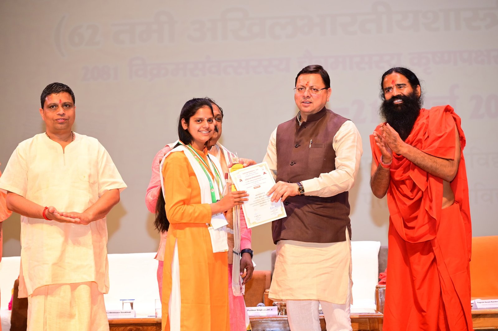 मुख्यमंत्री ने देश के 25 से भी अधिक प्रांतों तथा पड़ोसी देश नेपाल से आए हुए विद्वानजन, शोधकर्ताओं, शास्त्र प्रेमी और विद्यार्थियों एवं देश के भावी कर्णाधारों जो देश और दुनिया में भारत के सनातन, संस्कृति और संस्कारों को दुनिया के अंदर ले जाने का जिनके ऊपर दायित्व है ऐसे सभी पधारे महानुभावों का देवभूमि उत्तराखंड में स्वागत व करते हुए, स्वामी रामदेव, आचार्य बाल कृष्ण एवं समस्त पतंजलि परिवार को विशेष रूप से धन्यवाद देते हुए कहा कि इनके द्वारा प्राचीन भारतीय ज्ञान को आने वाली नई पीढ़ियों तक पहुंचाने का जो महा अभियान प्रारंभ किया गया है उसके सफल परिणाम हमारे सामने आने लगे है।